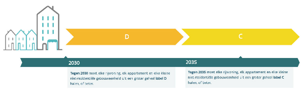 Voor appartementsgebouwen is het voorstel om vanaf 2030 een bijkomend traject te volgen, waarbij een minimaal gebouwlabel zal worden opgelegd aan het appartementsgebouw in zijn geheel los van verkoop. Dit traject zal in het voorjaar van 2024 in de regelgeving worden vastgelegd.