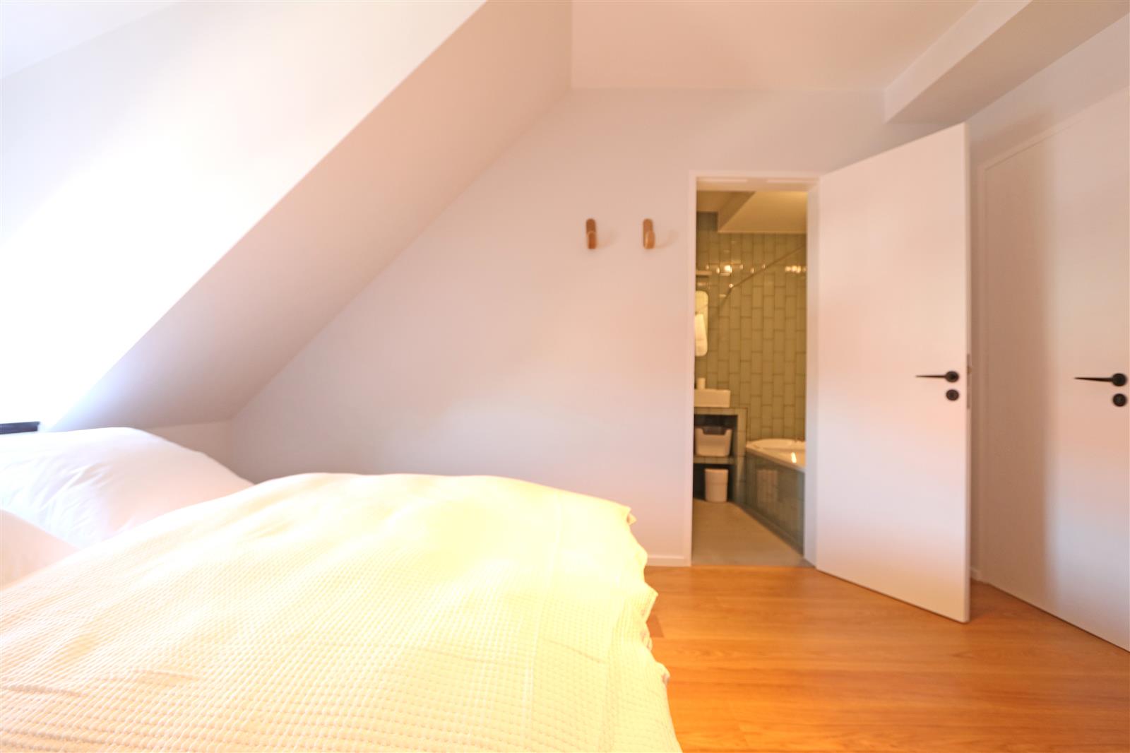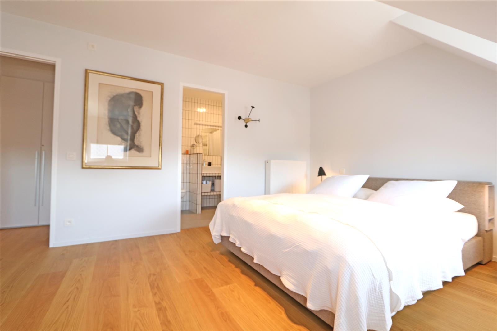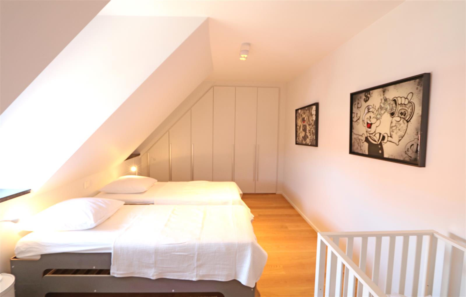 Charmant duplex penthouse, aménagé avec goût et doté d’une cuisine ouverte. Il dispose de vastes terrasses ensoleillées à l’avant et à l’arrière. Au rez-de-chaussée se trouve une première chambre double avec salle de bain privative. À l’étage supérieur, deux autres chambres : une grande chambre double avec salle de bain complète et une chambre d’enfant avec salle de douche attenante. Un garage dans la résidence est inclus.